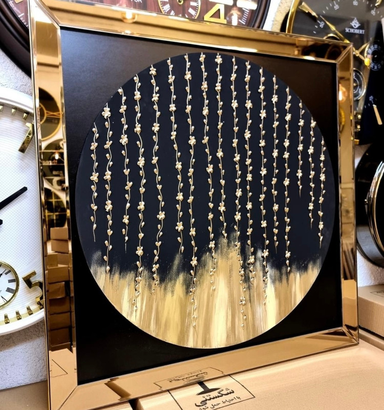 پشت کار ام دی اف و پروفیل٫طرح برجسته استفاده از خمیر تکسچر و ورق طلا٫توجه داشته باشین که خود طرح روی ام دی اف۶میل کار شده و سپس در مرکز تابلو قرار داده شده٫آینه های دور تماما تراش خورده