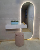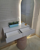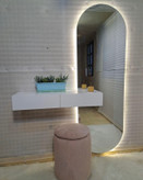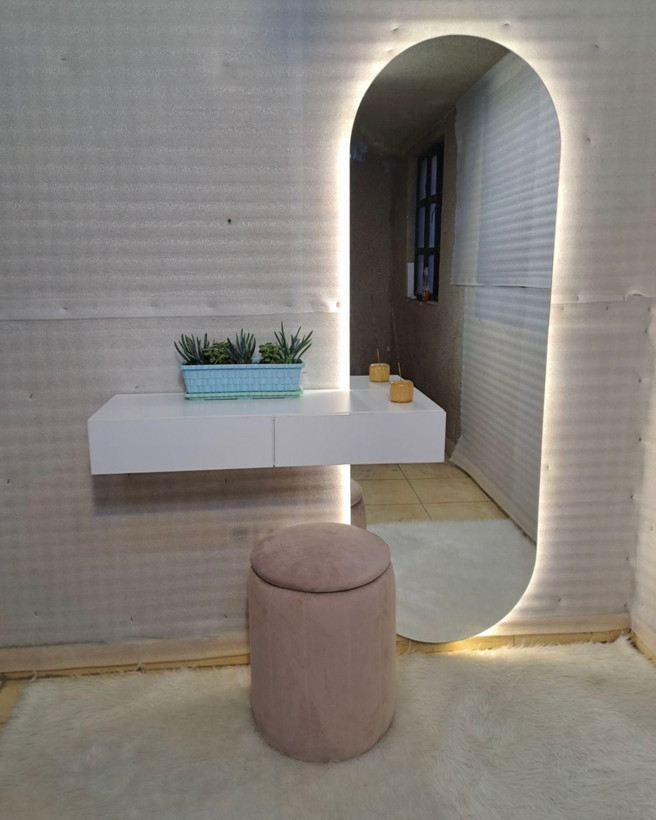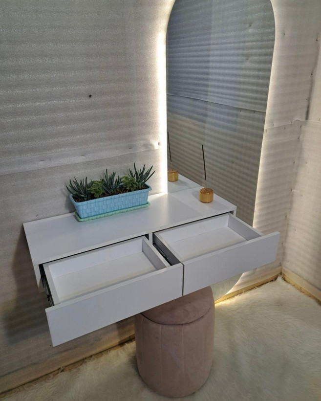 میز آرایش دیواری کم جا مانلی به همراه آینه قدی و پاف