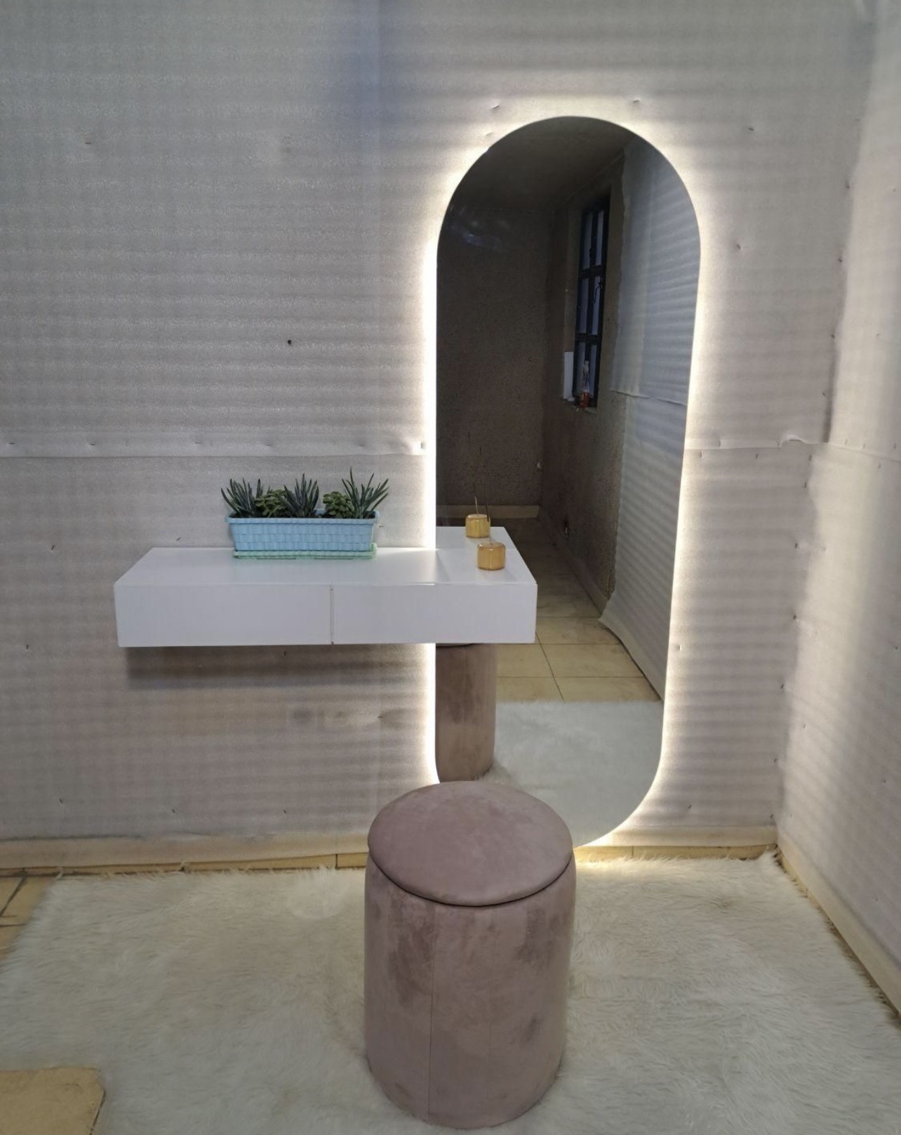 میز آرایش دیواری کم جا مانلی به همراه آینه قدی و پاف